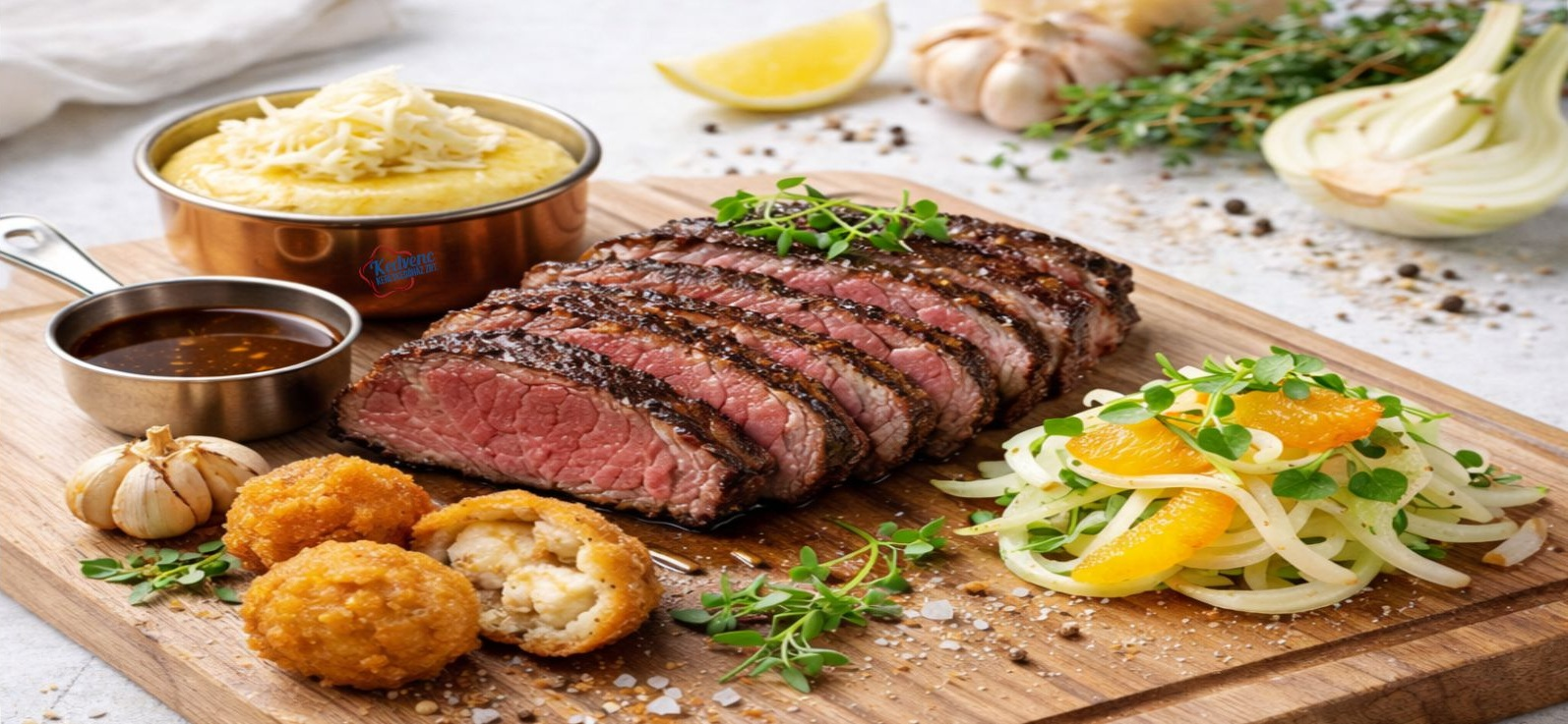 A ribeye steaket fóliába tekerve formázzuk, hűtjük, majd 250 g-os szeletekre vágjuk. Serpenyőben kérgesítjük, 48 °C maghőig sütőben húzatjuk, végül vajjal, kakukkfűvel és fokhagymával frottírozzuk.