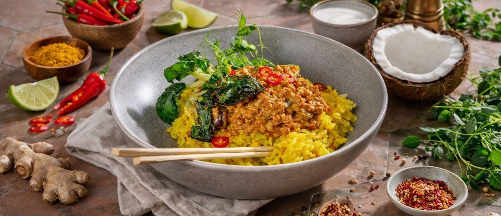A vörös curry paszta és a Kukta Fűszerpaprika kombinációja kiemeli a rendang ízvilágát és színét, a Sárgaborsó-fehérje pedig tökéletesen helyettesíti a húst.