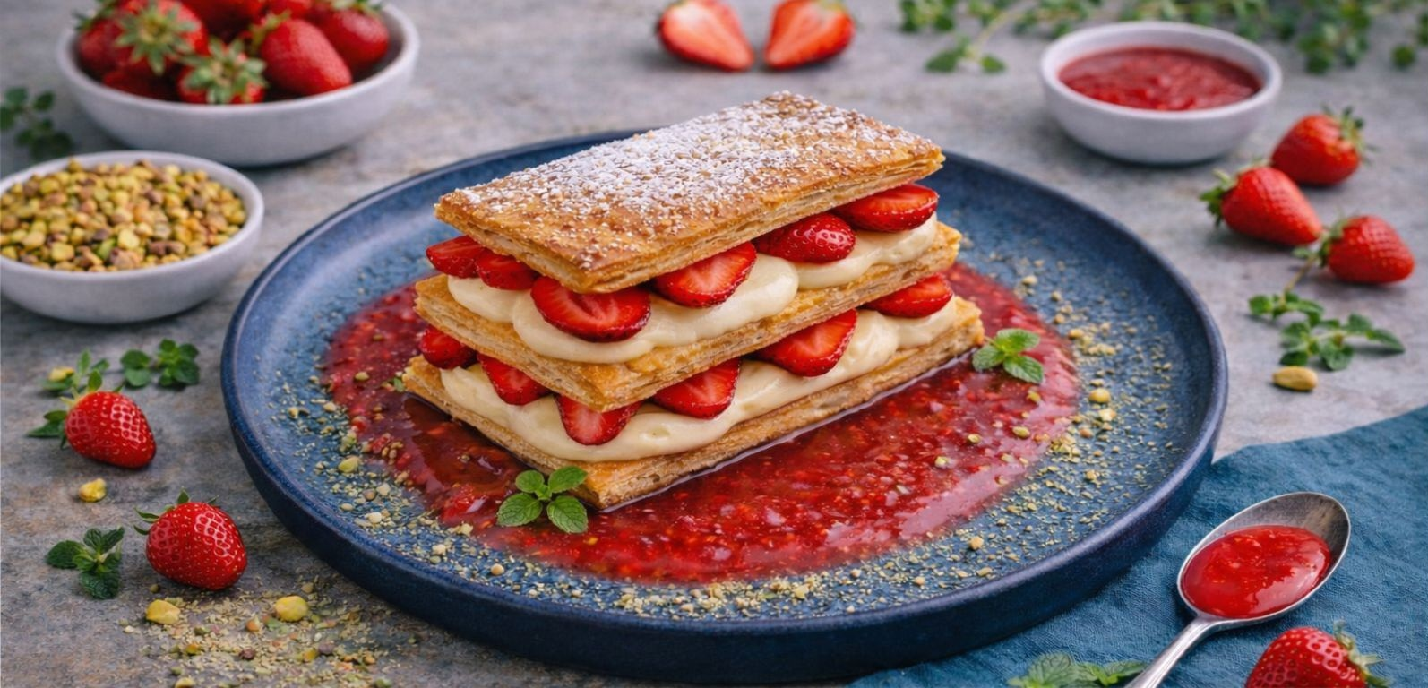 Epres mille-feuille eper coulis-val, pisztáciával és mentával