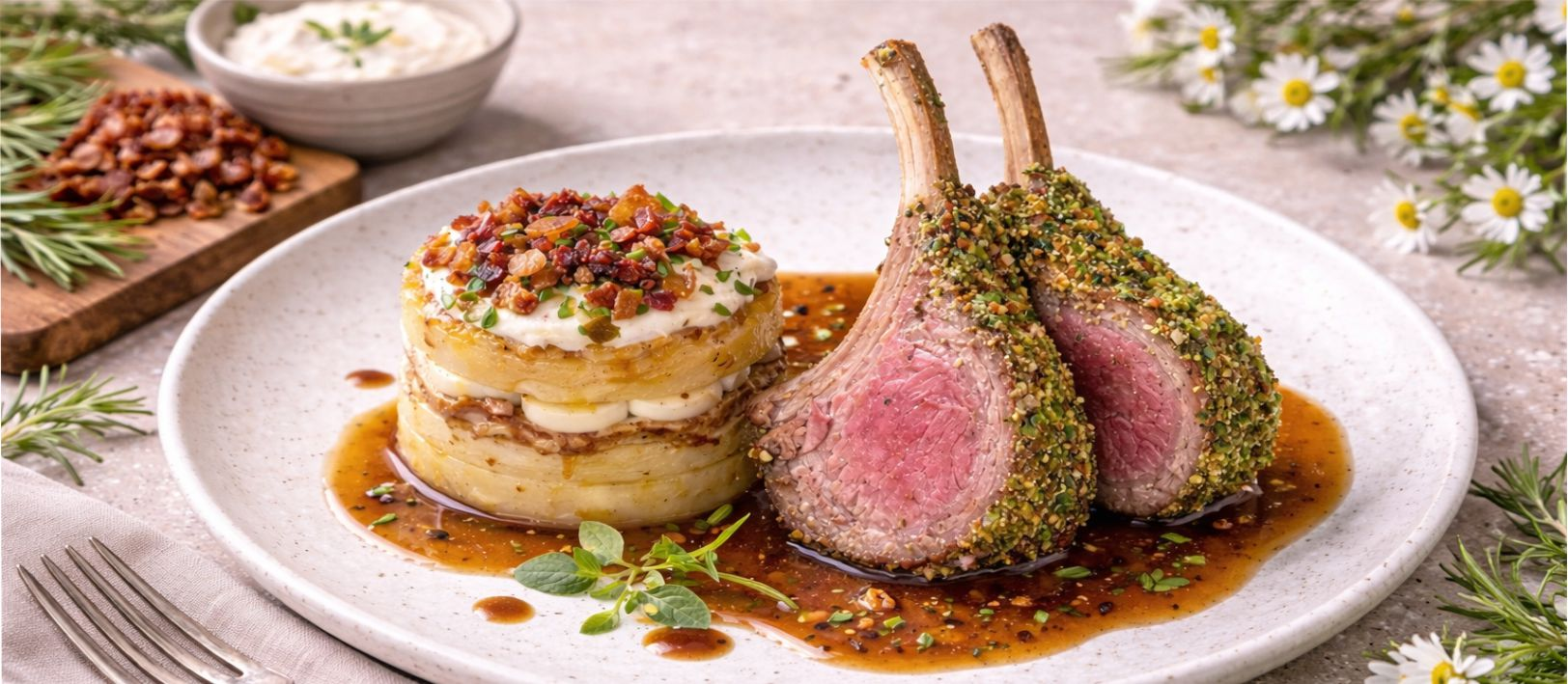 Rozmaringos bárány French rack zöldfűszeres kéreggel és guancialés rakott burgonyával