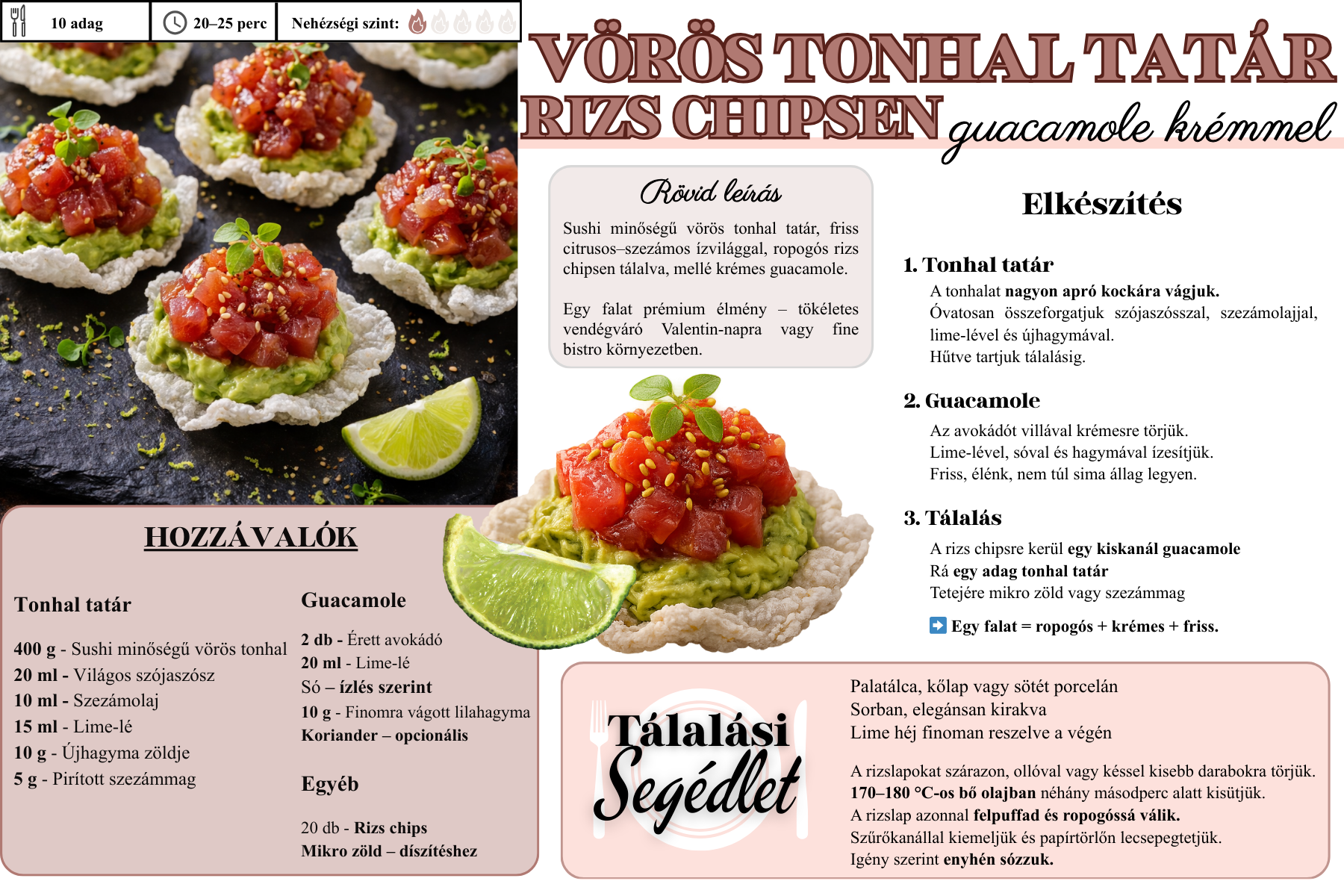 Vörös tonhal tatár rizs chipsen, guacamole krémmel